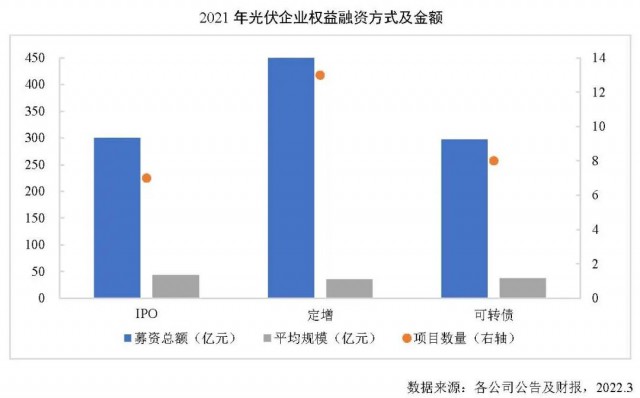 2021年我國光伏行業(yè)融資環(huán)境持續(xù)改善,共27家光伏企業(yè)在A股及港股資本市場使用權(quán)益融資方式募資,涉及權(quán)益融資項(xiàng)目28個(gè),募資總額1058.33億元,同比增長48.2%。其中,再融資項(xiàng)目21個(gè),募集資金758億元,同比增長30%;IPO上市融資項(xiàng)目7個(gè),募集資金301億元,同比增長129.2%。截至2022年3月,2021年權(quán)益融資項(xiàng)目中,已完成融資合計(jì)700.77億元,同比增長16.3%。