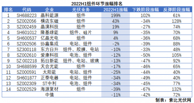 值得注意的是,同樣受硅料價格暴漲盈利能力承壓的組件環(huán)節(jié)的表現(xiàn)遠(yuǎn)不及電池片環(huán)節(jié),平均漲幅僅為-11%,其中缺少全球化渠道布局的二三線廠商跌幅居前,而晶科能源、晶澳科技、隆基綠能三大組件巨頭均取得了正收益,但除了剛剛上市的晶科能源以外,漲幅相對有限。