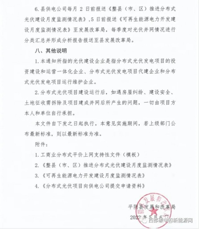 山東省濟(jì)南市平陰縣發(fā)改局印發(fā)《關(guān)于進(jìn)一步加強(qiáng)分布式光伏項(xiàng)目備案、建設(shè)及并網(wǎng)管理的意見》,文件提出分布式光伏應(yīng)就地就近消納。原創(chuàng)上各類光伏總計(jì)開發(fā)規(guī)模不應(yīng)超過本區(qū)域全年最大用電負(fù)荷60%,避免向220千伏及以上電網(wǎng)反送電。根據(jù)就地就近消納要求,原則上分布式光伏電力在接入電壓等級及以下電網(wǎng)范圍內(nèi)消納。
