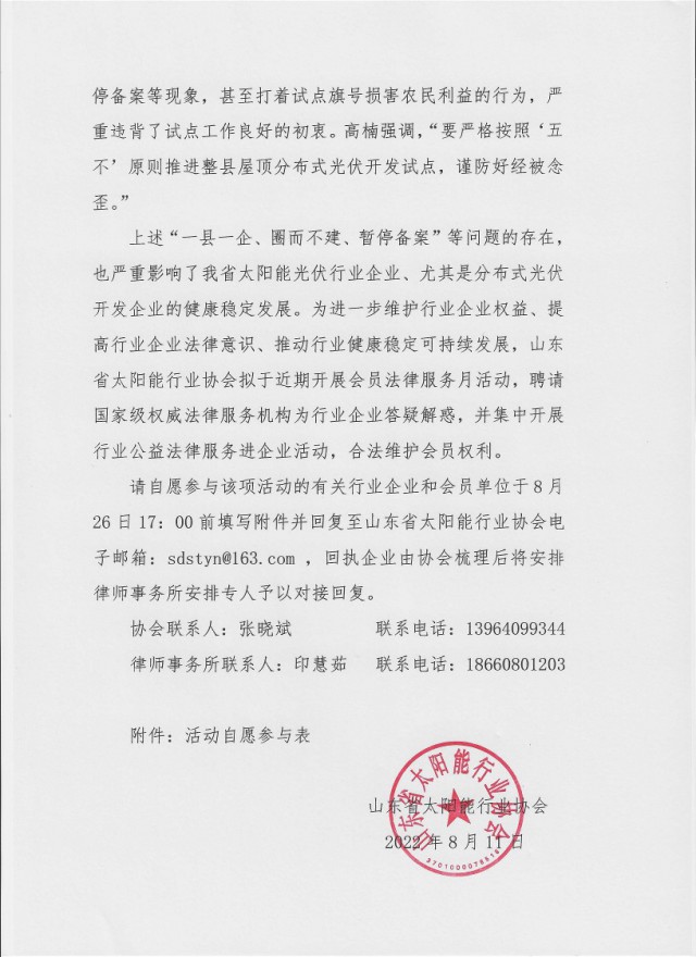 請自愿參與該項活動的有關行業(yè)企業(yè)和會員單位于8月26日17:00 前填寫附件并回復至山東省太陽能行業(yè)協(xié)會電子郵箱:[email protected],回執(zhí)企業(yè)由協(xié)會梳理后將安排律師事務所安排專人予以對接回復。