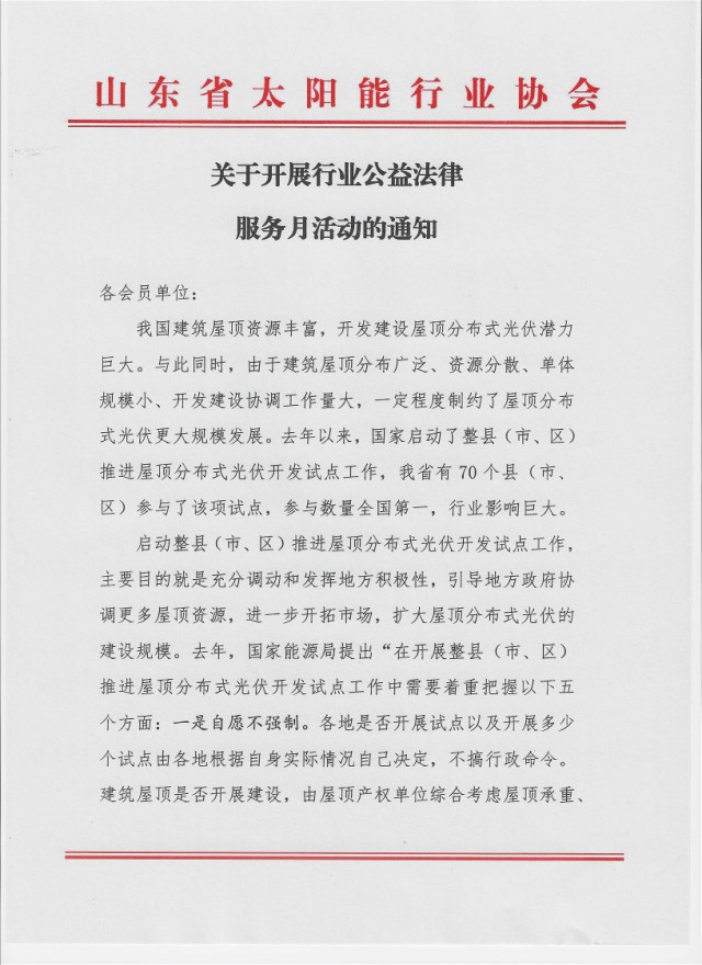 上述“一縣一企、圈而不建、暫停備案”等問題的存在,也嚴重影響了我省太陽能光伏行業(yè)企業(yè)、尤其是分布式光伏開發(fā)企業(yè)的健康穩(wěn)定發(fā)展。為進一步維護行業(yè)企業(yè)權益、提高行業(yè)企業(yè)法律意識、推動行業(yè)健康穩(wěn)定可持續(xù)發(fā)展,山東省太陽能行業(yè)協(xié)會擬于近期開展會員法律服務月活動,聘請國家級權威法律服務機構為行業(yè)企業(yè)答疑解惑,并集中開展行業(yè)公益法律服務進企業(yè)活動,合法維護會員權利。