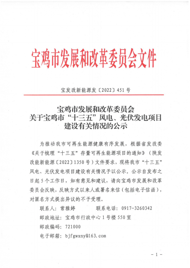 根據(jù)省發(fā)展改革委《關(guān)于梳理“十三五”存量可再生能源項目的通知》(陜發(fā)改能新能源〔2022〕1350號)文件要求,現(xiàn)將我市擬上報省發(fā)改委“十三五”風(fēng)電、光伏發(fā)電項目建設(shè)有關(guān)情況予以公示。公示自發(fā)布之日起5個工作日,如有意見和建議,請向渭南市發(fā)展和改革委員會反映,反映方式以來人或署名來信(包括電子信函),對匿名方式提出異議的不予受理。
