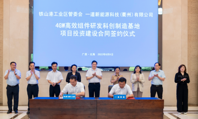 6月9日,一道新能簽約北海市投資建設的10GW高效組件研發(fā)科創(chuàng)制造基地項目,其中一期4GW高效組件研發(fā)科創(chuàng)制造基地項目將建設6條光伏組件生產(chǎn)線。