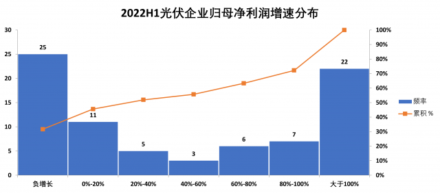 相比于營(yíng)收的普漲態(tài)勢(shì),光伏企業(yè)的經(jīng)營(yíng)業(yè)績(jī)卻出現(xiàn)顯著分化。2022年上半年,79家光伏企業(yè)的歸母凈利潤(rùn)總額達(dá)到650億元,平均增速為32%。其中,利潤(rùn)負(fù)增長(zhǎng)的企業(yè)占比高達(dá)32%,而業(yè)績(jī)翻倍增長(zhǎng)的企業(yè)占比亦達(dá)到28%,呈現(xiàn)顯著的“兩極分化”態(tài)勢(shì)。不過(guò),與2021年不同的是,產(chǎn)業(yè)鏈中游的諸多專業(yè)化廠商紛紛迎來(lái)“困境反轉(zhuǎn)”,而業(yè)績(jī)出現(xiàn)下滑的企業(yè)多為競(jìng)爭(zhēng)力一般的中小市值企業(yè)。