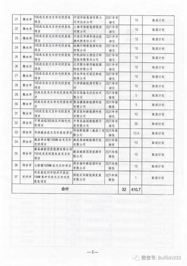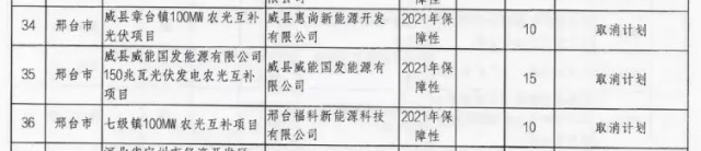 根據(jù)文件來看,相比此前發(fā)布的《風(fēng)電、光伏發(fā)電項目擬調(diào)整情況公示》來看,光伏新增取消三個2021年光伏保障性項目指標(biāo),規(guī)??傆嫗?50MW,風(fēng)電則未發(fā)生變化。需要注意的是,三個光伏項目均為農(nóng)光互補(bǔ)類項目,其業(yè)主分別為惠尚新能源開發(fā)、威縣威能國發(fā)能源以及中國電建。