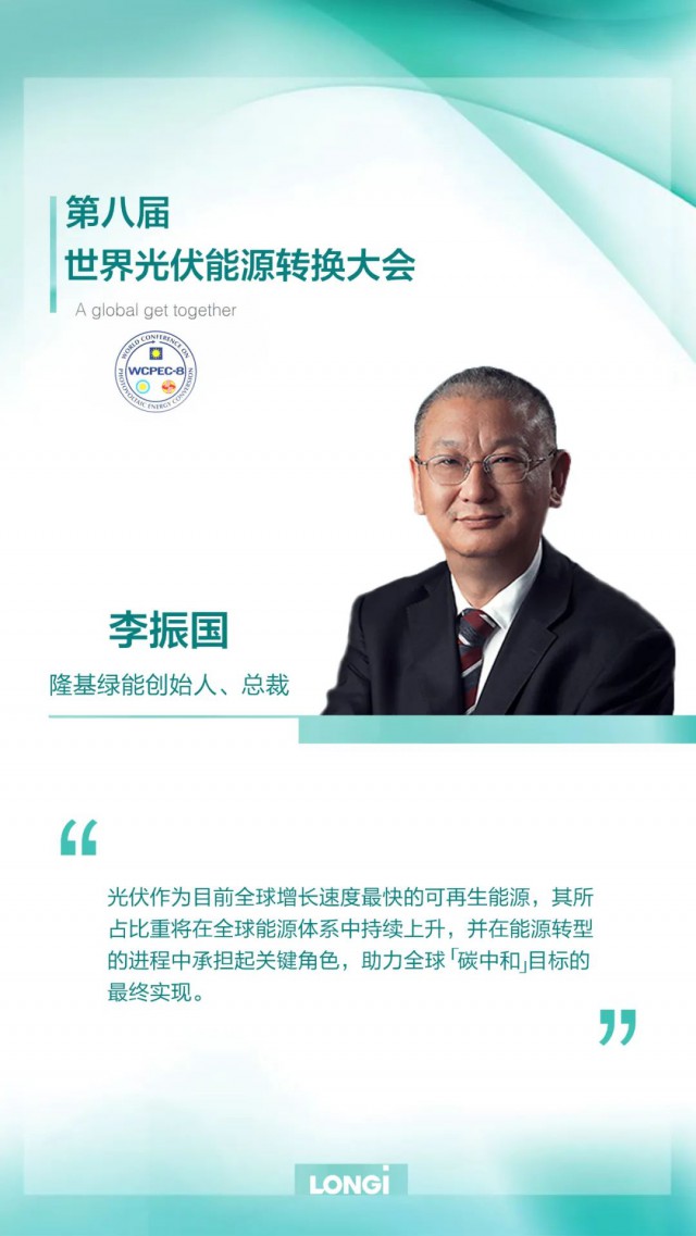 “站在全球能源轉型的十字路口,我們現(xiàn)在做出的每個決定都事關宜居地球的未來”。9月26日,第八屆世界光伏能源轉換大會(WCPEC-8)在意大利米蘭開幕,隆基綠能創(chuàng)始人、總裁李振國以視頻形式出席大會,并發(fā)表主題演講。