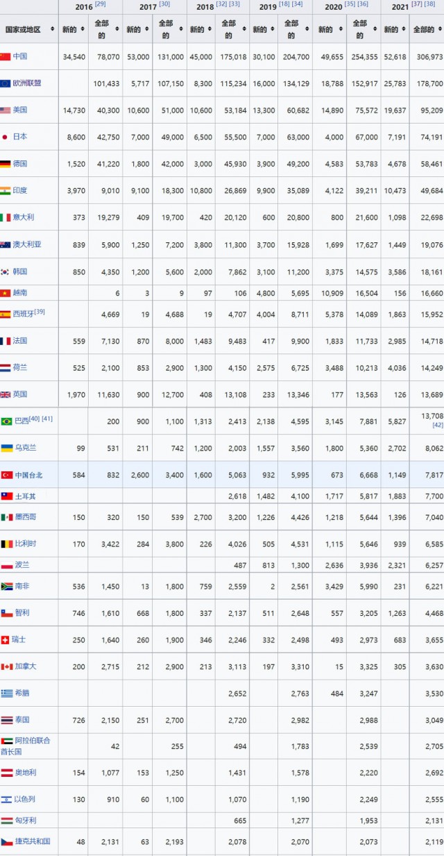 國際可再生能源署2021年度世界各國光伏裝機統(tǒng)計(單位:MW)