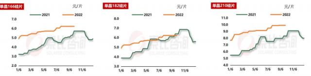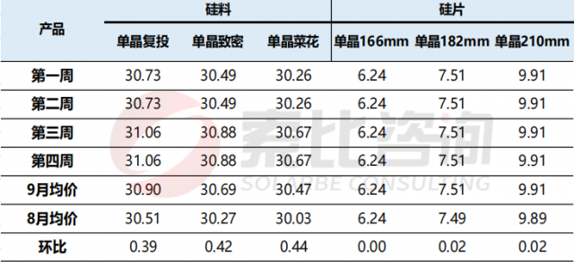 根據(jù)索比咨詢對(duì)多家電池片制造商的調(diào)研:就9月硅片價(jià)格行情來看,單晶166mm均價(jià)6.24元/片,較9月環(huán)比持平;單晶182mm均價(jià)漲至7.51元/片,較8月環(huán)比上漲0.27%;單晶210mm均價(jià)漲至9.91元/W,較8月環(huán)比上升0.20%。