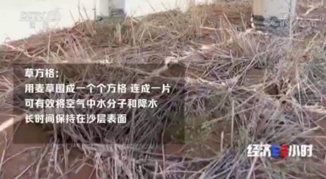 在中衛(wèi)沙漠光伏產(chǎn)業(yè)園,隨處可以見到這種四四方方的格子,這就是當(dāng)?shù)刂紊车拿孛芪淦?-草方格。用麥草圍成一個個方格連成一片,可以有效將空氣中的水分子和降水長時間保持在沙層表面,為淺根性植物的生長提供水分,在方格中央及周圍撒上草籽,一旦有雨水,它們就能長得很好,而且在植物生長過程中,連成片的光伏板阻擊發(fā)揮了重要的庇護(hù)和助力作用。光伏板大面積安裝后,白天為地面植物擋住過強(qiáng)的陽光,有效降低地表水蒸發(fā),并且有效降低風(fēng)速。夜間光伏板會凝聚部分水分,早上太陽一出來,露水滴下來滋潤著光伏園內(nèi)的土壤,有了光伏板的庇護(hù),植物在沙漠中可以更好的扎根生長。