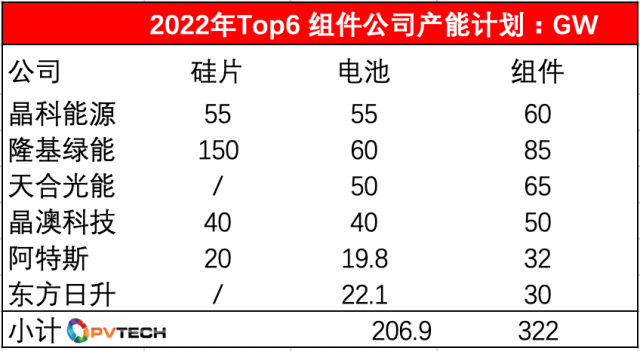 而根據(jù)晶科、隆基、天合、晶澳、阿特斯、東方日升 2022中報披露的數(shù)據(jù),到2022年底,各家組件規(guī)劃產(chǎn)能分別為60GW、85GW、65GW、50GW、32GW、30GW,這六 家公司2022 年底組件產(chǎn)能將達(dá)到322 GW,數(shù)值驚人。