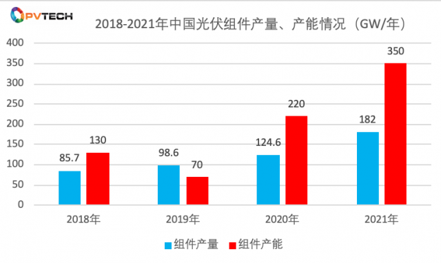 中國光伏行業(yè)協(xié)會(CPIA)數(shù)據(jù)顯示,2021年中國光伏組件產(chǎn)能為350 GW/年,同比增59.09%;該年實(shí)際組件產(chǎn)量為182GW,同比2020年增46.07%。