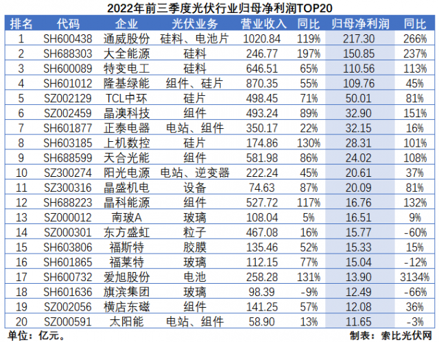 從營收規(guī)模來看,硅料和組件依然是創(chuàng)收能力最強的環(huán)節(jié)。而且,多數(shù)企業(yè)前三季度營業(yè)收入均已超過2021年全年,且創(chuàng)歷史新高。其中,通威股份營收規(guī)模首次突破千億大關(guān),達(dá)到1021億元;隆基綠能二、三季度邊際改善顯著,環(huán)比增速分別達(dá)到71%和15%,營收規(guī)模達(dá)到870.35億元;特變電工受益于硅料、煤炭產(chǎn)品的“量價齊升”,達(dá)到646.51億元。