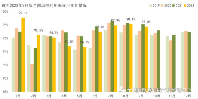 截至9月底全國(guó)風(fēng)電利用率逐月變化情況