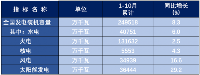 截至今年10月底,全國累計發(fā)電裝機容量約24.952億千瓦。其中,光電3.644億千瓦,風(fēng)電3.494億千瓦,水電4.075億千瓦,核電0.555億千瓦,火電13.163。