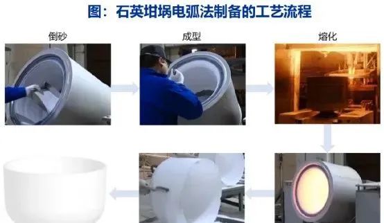 電弧法是制備石英坩堝的主流制備技術。將高純的石英砂原料倒入坩堝模具內,通過成型裝置將石英砂原料均勻的成型在模具的內表面以成型坩堝坯,然后將坩堝模具整體移入電弧熔制爐內,通過石墨電極釋放高溫電弧使石英砂熔化,最后快速冷卻形成石英坩堝毛坯。石英坩堝分為內層透明層、中層氣泡復合層和外層薄氣泡層,各層質量占比分別為25%-70%、20%-40%和5%-30%,通常比例為4:3:4或者3:4:3。