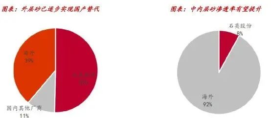 光伏石英坩堝產品端:光伏行業(yè)由于產品精密度程度高、技術發(fā)展快,對石英坩堝的純度、精度要求日益嚴格。我國的石英制品行業(yè)起步較晚,只有少數(shù)規(guī)?;髽I(yè)的石英坩堝技術方面達到先進水平。技術上來看,近幾年我國石英制品行業(yè)的技術進步較為明顯,尤其是石英坩堝技術水平與國外企業(yè)產品的差距逐步縮小,在坩堝尺寸、純度、拉晶時間和拉晶次數(shù)等方面均取得顯著進步。此外,國內石英坩堝具有一定的成本優(yōu)勢,在質量和性能等方面與進口石英坩堝的差距正逐漸縮小。這些都為國產化創(chuàng)造了條件。從細分部件來看,外層砂已基本實現(xiàn)國產替代,中內層砂產品和客戶認可度逐步提升。目前石英股份的高純石英砂仍以外層砂為主,我們預計石英股份在中內層砂質量以及客戶認可度上均有提升,并有望逐步提高中內層砂的滲透率。我們預計21年石英股份外層砂份額約50%,中內層砂份額約8%。