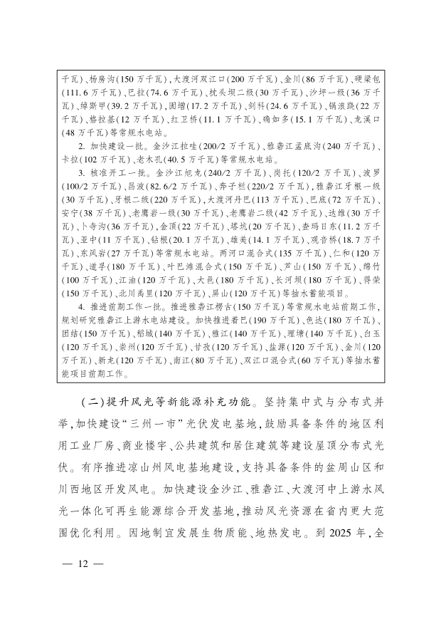 提升風(fēng)光等新能源補充功能。堅持集中式與分布式并舉,加快建設(shè)“ 三州一市” 光伏發(fā)電基地,鼓勵具備條件的地區(qū)利用工業(yè)廠房、商業(yè)樓宇、公共建筑和居住建筑等建設(shè)屋頂分布式光伏。有序推進(jìn)涼山州風(fēng)電基地建設(shè),支持具備條件的盆周山區(qū)和川西地區(qū)開發(fā)風(fēng)電。加快建設(shè)金沙江、雅礱江、大渡河中上游水風(fēng)光一體化可再生能源綜合開發(fā)基地,推動風(fēng)光資源在省內(nèi)更大范圍優(yōu)化利用。因地制宜發(fā)展生物質(zhì)能、地?zé)岚l(fā)電。到2025年,全省光伏發(fā)電、風(fēng)電裝機(jī)分別新增2004萬千瓦、473萬千瓦,分別達(dá)2200萬千瓦、1000萬千瓦以上。