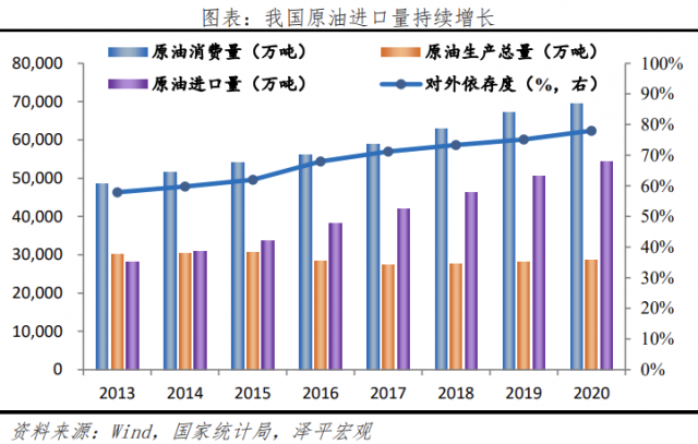 二是對國家能源安全的保障。在交通運輸領域,我國石油消費量正不斷走高,從2015年的5.43億噸/年上升至2020年的7.36億噸/年。然而我國原油產(chǎn)量則一直維持在2億噸/年。供需矛盾致使我國的原油進口量持續(xù)增長,對外依存度超過70%。為保證國家的能源安全和經(jīng)濟的可持續(xù)發(fā)展,能源消費結構亟需升級。而發(fā)展新能源發(fā)電有利于減少我國對能源進口的依賴,保障國家能源安全。