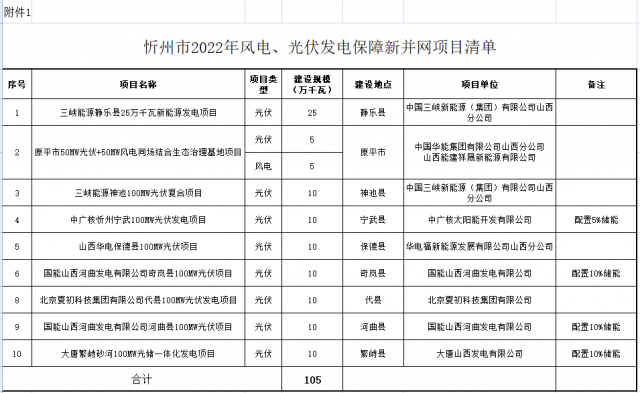 按照山西省能源局《關(guān)于下達(dá)山西省2022年風(fēng)電光伏發(fā)電保障性并網(wǎng)年度建設(shè)計劃的通知》(晉能源新能源發(fā)〔2022〕428號)和《關(guān)于下達(dá)山西省2022年支持新能源產(chǎn)業(yè)發(fā)展風(fēng)電光伏發(fā)電建設(shè)計劃的通知》(晉能源新能源發(fā)〔2022〕429號),2022年度山西省能源局共下達(dá)我市風(fēng)電、光伏發(fā)電項目共27個326萬千瓦,其中下達(dá)2022年度保障性并網(wǎng)項目9個105萬千瓦(詳見附件1),下達(dá)支持新能源產(chǎn)業(yè)發(fā)展風(fēng)電、光伏發(fā)電建設(shè)項目18個221萬千瓦(詳見附件2)。為做好項目建設(shè)有關(guān)工作,現(xiàn)就有關(guān)要求通知如下: