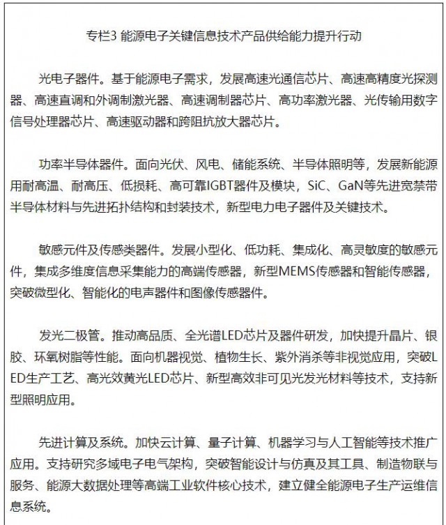加強面向新能源領域的關鍵信息技術產品開發(fā)和應用,主要包括適應新能源需求的電力電子、柔性電子、傳感物聯(lián)、智慧能源信息系統(tǒng)及有關的先進計算、工業(yè)軟件、傳輸通信、工業(yè)機器人等適配性技術及產品。研究小型化、高性能、高效率、高可靠的功率半導體、傳感類器件、光電子器件等基礎電子元器件及專用設備、先進工藝,支持特高壓等新能源供給消納體系建設。推動能源電子產業(yè)數(shù)字化、智能化發(fā)展,突破全環(huán)境仿真平臺、先進算力算法、工業(yè)基礎軟件、人工智能等技術。推動信息技術相關裝備及儀器創(chuàng)新發(fā)展。
