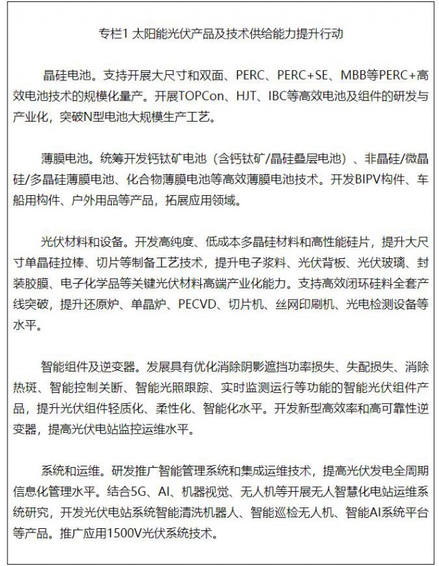 加快智能光伏創(chuàng)新突破,發(fā)展高純硅料、大尺寸硅片技術,支持高效低成本晶硅電池生產,推動N型高效電池、柔性薄膜電池、鈣鈦礦及疊層電池等先進技術的研發(fā)應用,提升規(guī)?;慨a能力。鼓勵開發(fā)先進適用的智能光伏組件,發(fā)展智能逆變器、控制器、匯流箱、跟蹤系統(tǒng)等關鍵部件。加大對關鍵技術裝備、原輔料研發(fā)應用的支持力度。鼓勵開發(fā)安全便捷的戶用智能光伏系統(tǒng),鼓勵發(fā)展光伏充電寶、穿戴裝備、交通工具等移動能源產品。探索建立光伏“碳足跡”評價標準并開展認證。加快構建光伏供應鏈溯源體系,推動光伏組件回收利用技術研發(fā)及產業(yè)化應用。