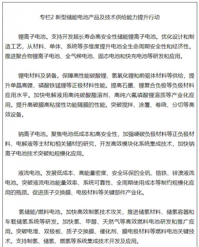 加強新型儲能電池產業(yè)化技術攻關,推進先進儲能技術及產品規(guī)?;瘧?。研究突破超長壽命高安全性電池體系、大規(guī)模大容量高效儲能、交通工具移動儲能等關鍵技術,加快研發(fā)固態(tài)電池、鈉離子電池、氫儲能/燃料電池等新型電池。推廣智能化生產工藝與裝備、先進集成及制造技術、性能測試和評估技術。提高鋰、鎳、鈷、鉑等關鍵資源保障能力,加強替代材料的開發(fā)應用。推廣基于優(yōu)勢互補功率型和能量型電化學儲能技術的混合儲能系統(tǒng)。支持建立鋰電等全生命周期溯源管理平臺,開展電池碳足跡核算標準與方法研究,探索建立電池產品碳排放管理體系。