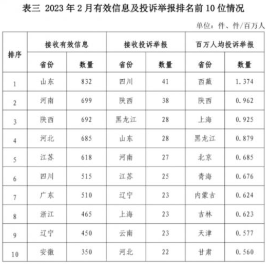 各省(自治區(qū)、直轄市)按照接收的有效信息數(shù)量排序,山東、河南、陜西、河北、江蘇、四川、廣東、浙江、遼寧、安徽排在全國前10位;按照接收的投訴舉報數(shù)量排序,四川、陜西、黑龍江、山東、河南、江蘇、遼寧、上海、云南、河北排在全國前10位;按照百萬人均投訴舉報數(shù)量排序,西藏、陜西、上海、黑龍江、北京、青海、內(nèi)蒙古、吉林、天津、甘肅排在全國前10位。(2023年2月有效信息及投訴舉報排名前10位情況見表三)