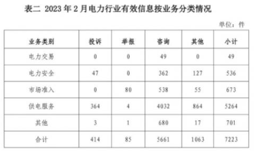 電力行業(yè)排在首位,有效信息數(shù)量為7223件,占全部有效信息的70.37%。群眾關(guān)注的內(nèi)容主要集中在供電服務(wù)、電力安全、成本價格和收費(fèi)等方面。(2023年2月電力行業(yè)有效信息按業(yè)務(wù)分類情況見表二)