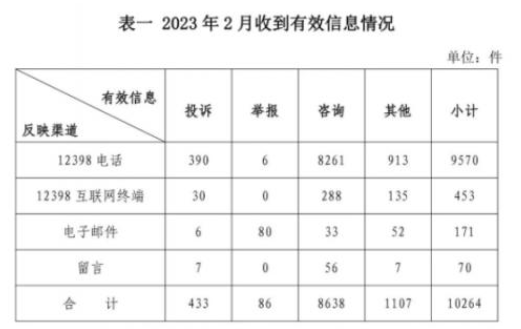 2023年2月,國家能源局12398能源監(jiān)管熱線(以下簡稱12398熱線)共收到有效信息10264件(包含投訴、舉報、咨詢和其他訴求類別),環(huán)比減少27.07%,同比增加22.69%。(2023年2月收到有效信息情況見表一)