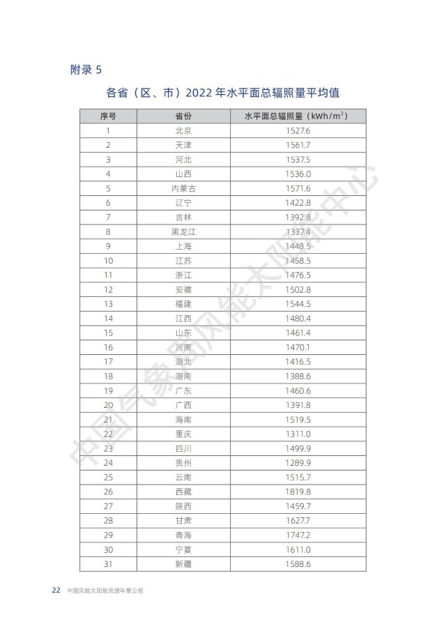 上圖為全國平均值,具體到各個省份的年水平面總輻射量、年傾斜面面總輻射量數值如下表所示。