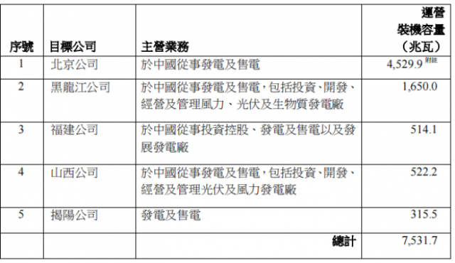 7月26日,中國電力發(fā)布《有關(guān)收購事項之主要及關(guān)連交易》,公告稱擬向控股股東國家電投收購清潔能源發(fā)電業(yè)務(wù),包括北京電力55.15%、黑龍江電力、福建電力、山西電力及揭陽前詹風(fēng)電各100%股權(quán),以加速打造公司作為國家電投清潔能源旗艦上市附屬。