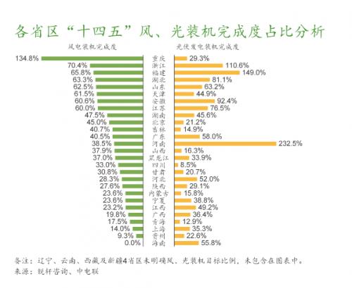 目前,河南及福建兩省已完成“十四五”新增風(fēng)、光裝機(jī)目標(biāo)。除此之外,大部分省區(qū)的光伏發(fā)電裝機(jī)完成度高于風(fēng)電。