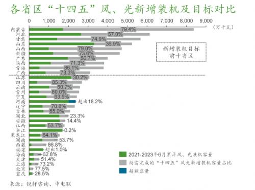 截至2023年6月末,全國(guó)31省區(qū)(不含港澳臺(tái))發(fā)布的“十四五”期末累計(jì)風(fēng)、光裝機(jī)目標(biāo)共計(jì)13.7億千瓦,包括此期間新增風(fēng)、光裝機(jī)目標(biāo)8.3億千瓦。