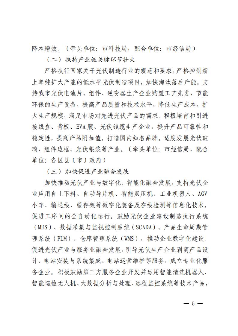 文件指出,到2025年,我市光伏產(chǎn)業(yè)技術(shù)水平達(dá)到國(guó)際先進(jìn),骨干企業(yè)市場(chǎng)競(jìng)爭(zhēng)能力明顯增強(qiáng),產(chǎn)業(yè)鏈配套協(xié)作能力顯著提升,光伏發(fā)電成本下降明顯,全市光伏產(chǎn)業(yè)產(chǎn)值超過260億元,光伏發(fā)電裝機(jī)規(guī)模確保達(dá)到500萬千瓦,力爭(zhēng)達(dá)到570萬千瓦,打造國(guó)內(nèi)重要的光伏產(chǎn)業(yè)高質(zhì)量發(fā)展高地。