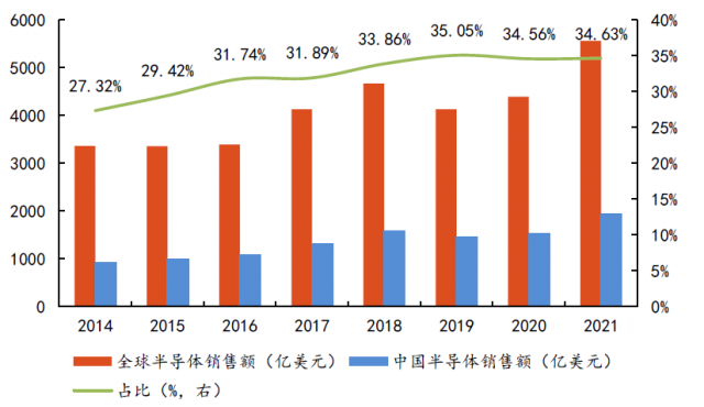 2014 -2021 全球、 中國(guó)半導(dǎo)體銷(xiāo)售額和占比