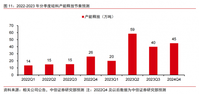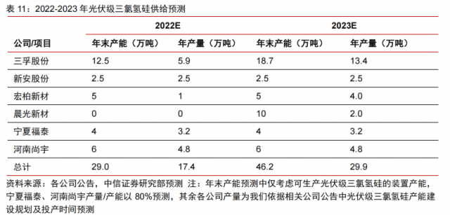 中信證券王喆在10月11日發(fā)布的研報中表示,根據(jù)2022-2023年多晶硅廠家擴產計劃,2022Q4季度與2023Q2季度將迎來硅料產能釋放密集期,可能會存在光伏級三氯氫硅出現(xiàn)短暫的供給缺口,屆時有望提振三氯氫硅價格,預計三氯氫硅高景氣度有望維持至2023Q2。