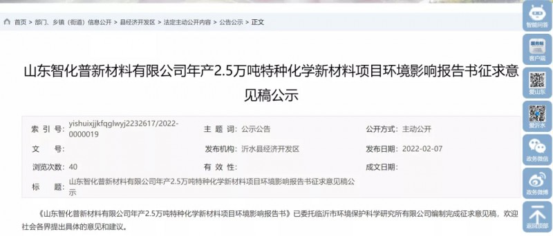 據(jù)悉,山東智化普新材料有限公司年產(chǎn)2.5萬噸特種化學(xué)新材料項(xiàng)目目前正在進(jìn)行環(huán)評。