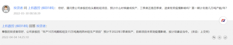 上機數(shù)控(603185.SH)4月4日在投資者互動平臺表示,公司參股的“年產10萬噸顆粒硅及15萬噸高純納米硅生產項目”預計于2022年3季度投產,目前項目未受到疫情影響,按計劃建設當中。