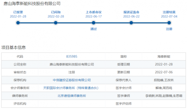 7月6日,中國證監(jiān)會同意海泰新能向不特定合格投資者公開發(fā)行股票并在北京證券交易所上市的注冊申請,公司將于近期正式登陸北交所。