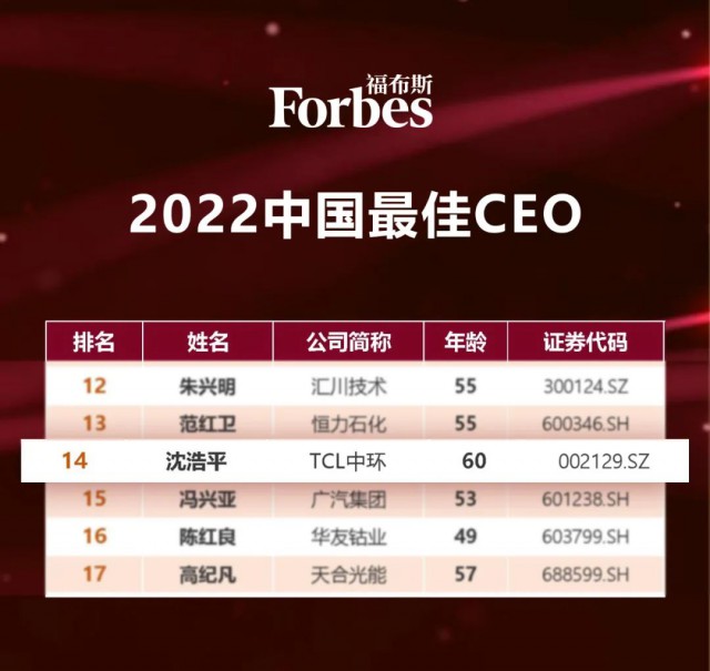 8月18日,福布斯中國發(fā)布2022中國最佳CEO榜,TCL中環(huán)總經(jīng)理沈浩平入選,位列第14位。
