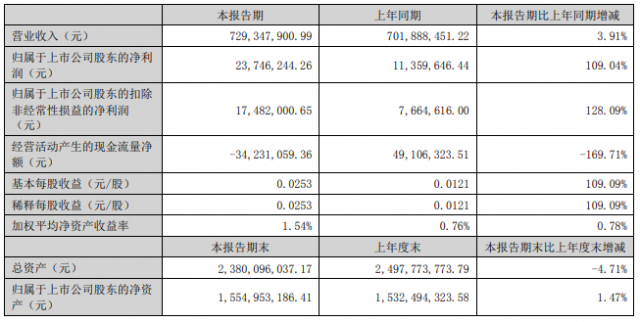 8月26日,北玻股份發(fā)布2022年上半年年度報告,報告期內(nèi),公司營業(yè)收入729,347,900.99元,同比增加3.91%,歸屬于上市公司股東的凈利潤23,746,244.26元,同比增加109.04%,詳情如下: