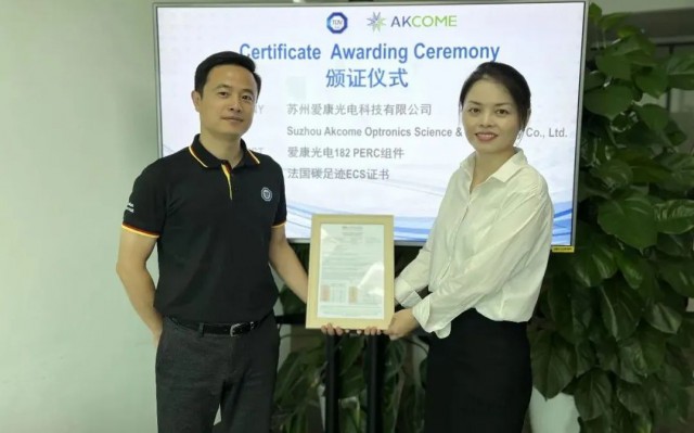 近日,TüV南德意志集團(tuán)(以下簡稱“TüV南德”)順利為蘇州愛康光電科技有限公司(以下簡稱“愛康光電”)完成182 PERC系列組件產(chǎn)品法國碳足跡ECS證書的交付,助力愛康光電的全球化戰(zhàn)略布局。