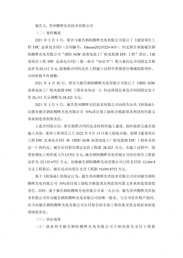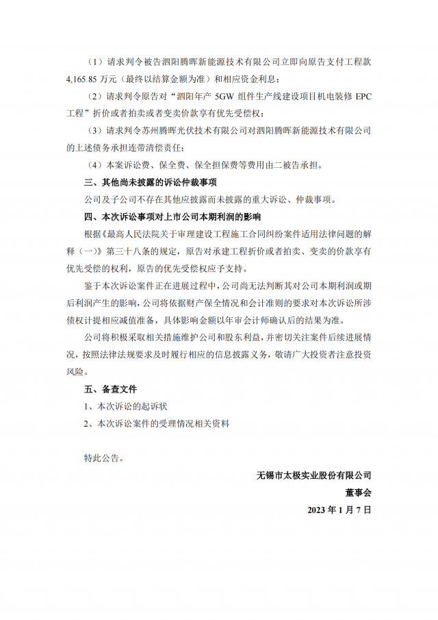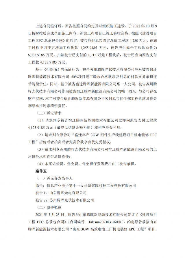 1月7日,太極實(shí)業(yè)發(fā)布公告,公司子公司信息產(chǎn)業(yè)電子第十一設(shè)計(jì)研究院科技工程股份有限公司(以下簡(jiǎn)稱“十一科技”)與蘇州騰暉光伏技術(shù)有限公司(以下簡(jiǎn)稱“蘇州騰暉”)及其子公司存在建設(shè)工程施工合同糾紛,十一科技已向法院提起訴訟及財(cái)產(chǎn)保全。本次相關(guān)訴訟案件共6件,合計(jì)涉案金額約3.88億元。目前,上述六起案件僅一件已被法院受理,其余訴訟案件,十一科技均已向法院遞交訴訟材料,目前正處于受理中。