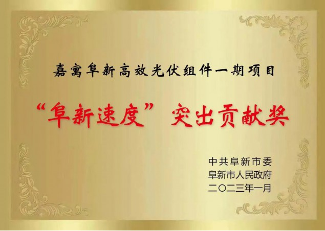 阜新市委副書記、市長(zhǎng)周鵬舉作全市全面振興新突破三年行動(dòng)啟動(dòng)動(dòng)員報(bào)告中提及嘉寓阜新產(chǎn)業(yè)園項(xiàng)目,鼓勵(lì)企業(yè)要牽頭實(shí)施綠能環(huán)保新項(xiàng)目,力爭(zhēng)在阜新市全面振興新突破三年行動(dòng)中再添新筆,并授予嘉寓阜新高效光伏組件一期項(xiàng)目“阜新速度”突出貢獻(xiàn)獎(jiǎng)稱號(hào)。