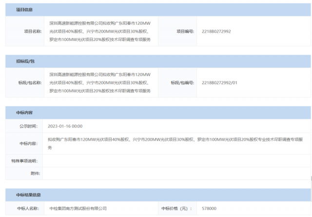 1月30日,深圳高速新能源控股有限公司公示了擬收購(gòu)廣東陽(yáng)春市120MW光伏項(xiàng)目40%股權(quán)、興寧市200MW光伏項(xiàng)目30%股權(quán)、羅定市100MW光伏項(xiàng)目20%股權(quán)技術(shù)盡職調(diào)查的中標(biāo)候選人,中檢集團(tuán)南方測(cè)試股份有限公司以57.8萬元的報(bào)價(jià)中標(biāo)。