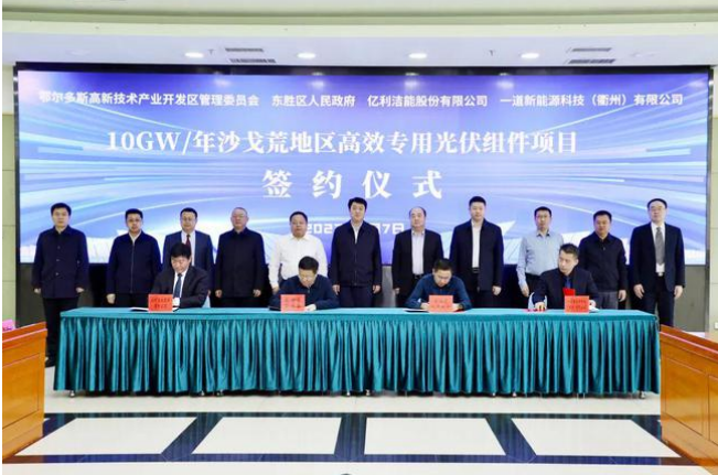 3月7日,在內(nèi)蒙古風(fēng)光氫儲產(chǎn)業(yè)集群重鎮(zhèn)鄂爾多斯東勝區(qū),億利潔能股份有限公司與鄂爾多斯高新技術(shù)產(chǎn)業(yè)開發(fā)區(qū)管委會、東勝區(qū)人民政府、一道新能源科技(衢州)有限公司成功簽約10GW沙戈荒地區(qū)高效專用光伏組件項(xiàng)目。