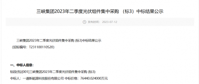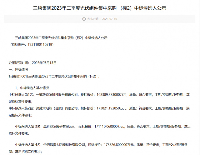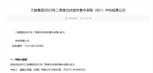7月28日,三峽2023年二季度光伏組件集中采購(標1)中標結(jié)果公示,通威以1.3元/瓦的報價獨享2249.4MW的光伏組件訂單,組件型號為P型545W+雙面。