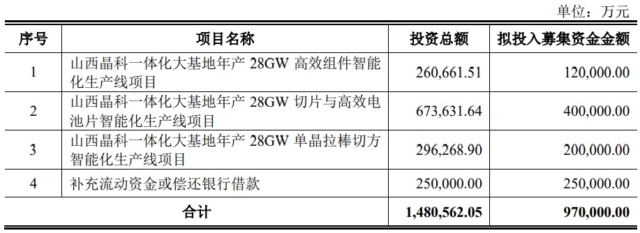 晶科能源向特定對象發(fā)行股票募集資金總額不超過970,000.00萬元(含本數(shù)),扣除相關(guān)發(fā)行費(fèi)用后的募集資金凈額,擬用于山西晶科一體化大基地年產(chǎn)28GW高效組件智能化生產(chǎn)線項(xiàng)目、山西晶科一體化大基地年產(chǎn)28GW切片與高效電池片智能化生產(chǎn)線項(xiàng)目、山西晶科一體化大基地年產(chǎn)28GW單晶拉棒切方智能化生產(chǎn)線項(xiàng)目、補(bǔ)充流動資金或償還銀行借款。