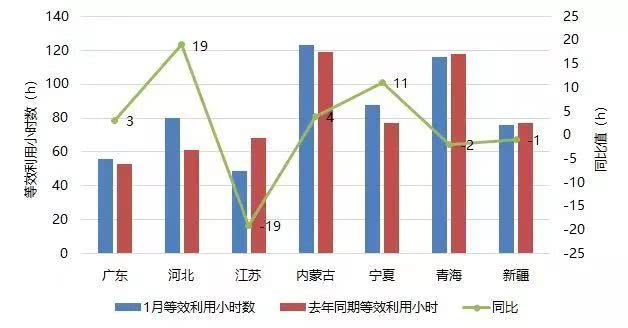由以上圖可以看出,2019年1月,除河北、江蘇、寧夏外,其他省份的利用小時數(shù)均與去年同期相差不大。江蘇的平均等效利用小時數(shù)較去年同期同比減少最多,達19小時!河北的平均等效利用小時數(shù)較去年同期同比增加19小時,寧夏的平均等效利用小時數(shù)較去年同期同比增加11小時。