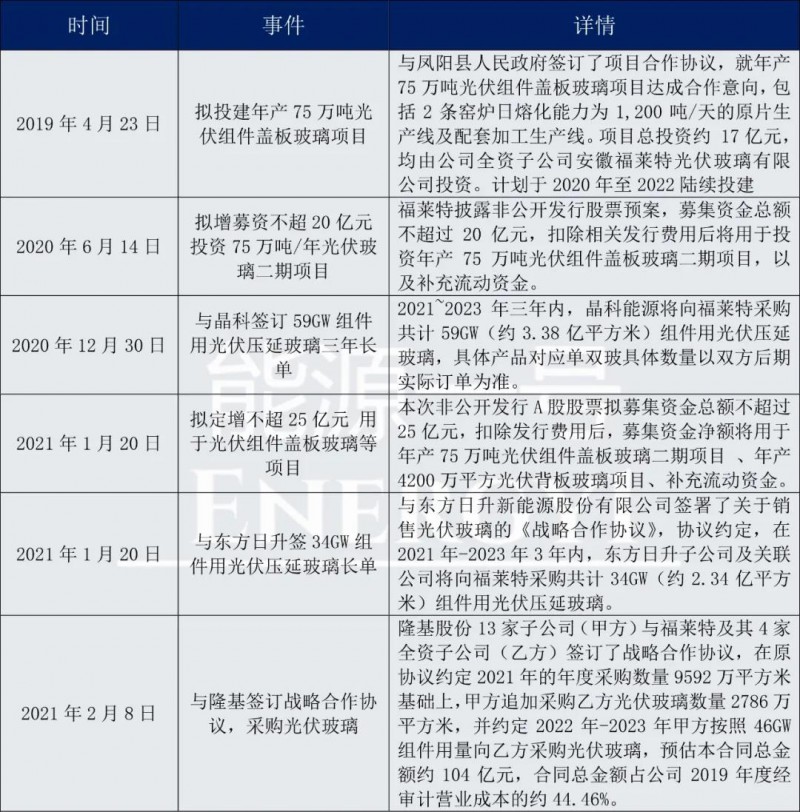 去年12月,它與晶科能源簽訂了59GW的組件用光伏壓延玻璃三年長單;今年1月和2月,福萊特再度分別與東方日升、隆基股份再簽大額長單,預(yù)計總計規(guī)模在200多億到300億左右。